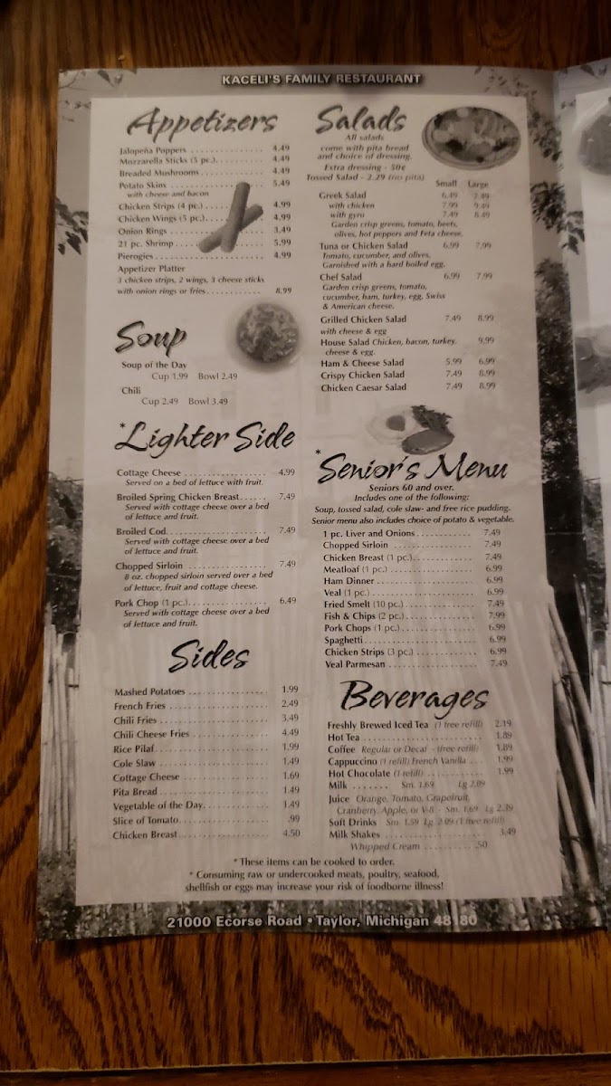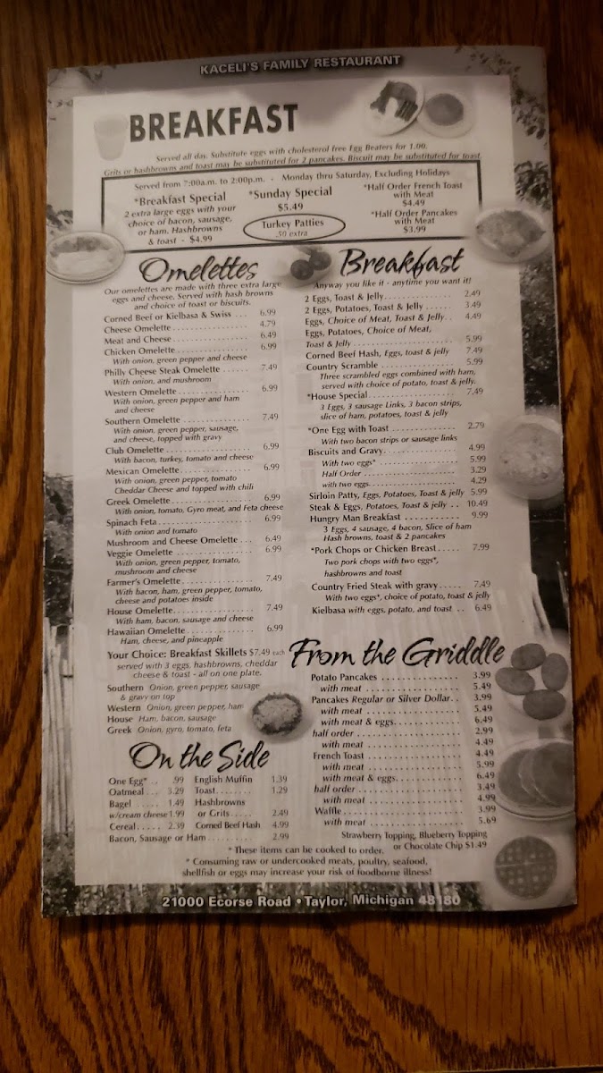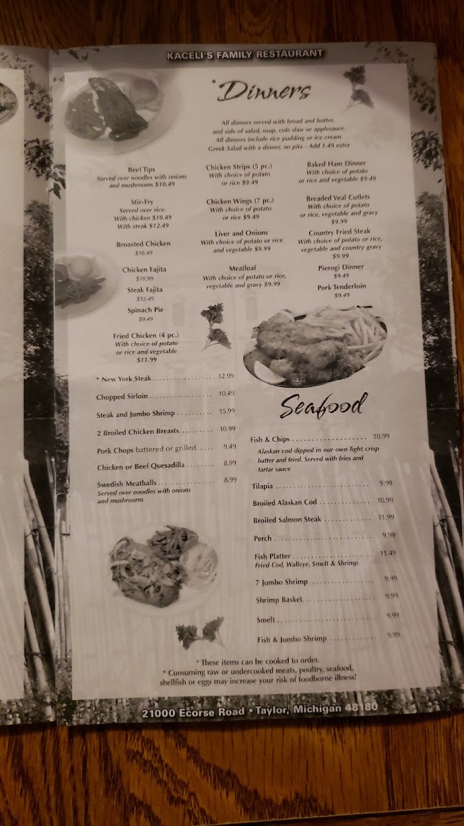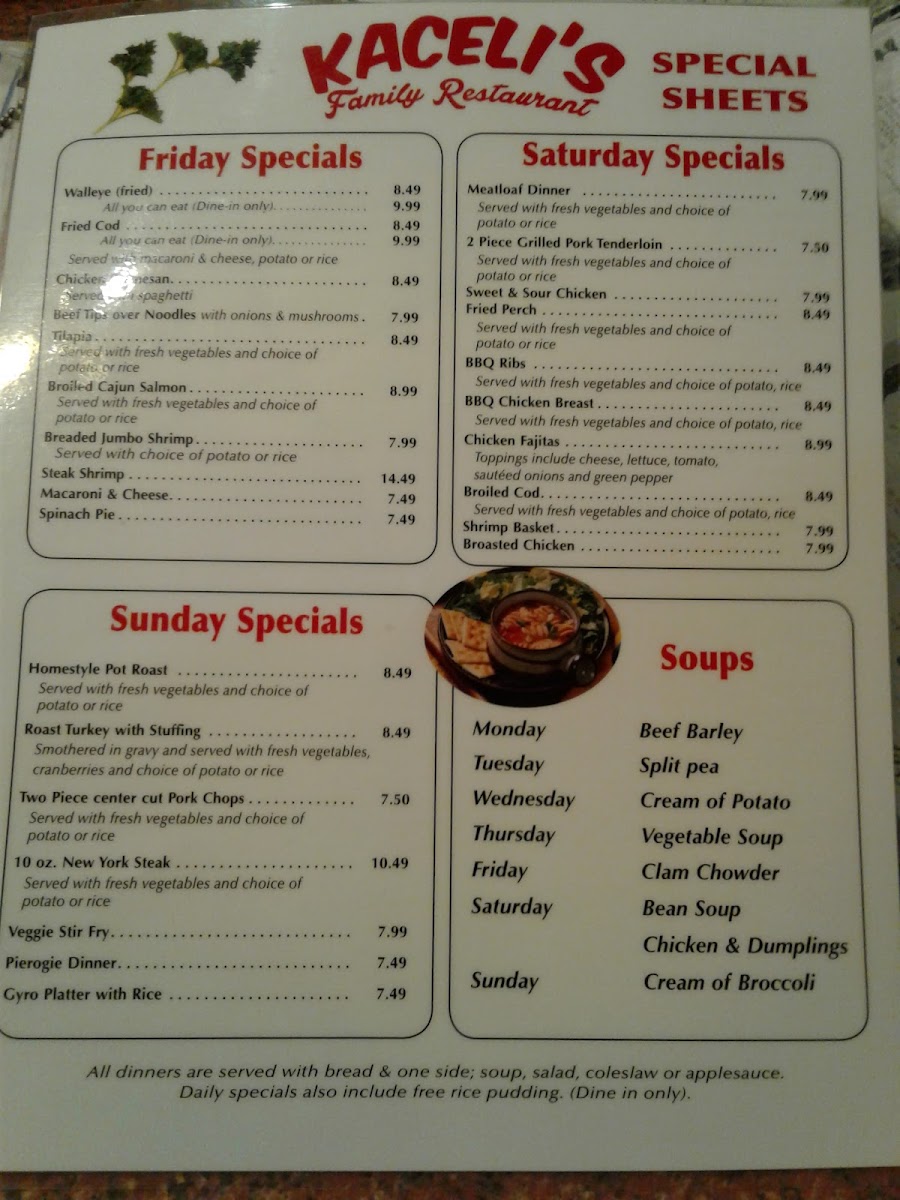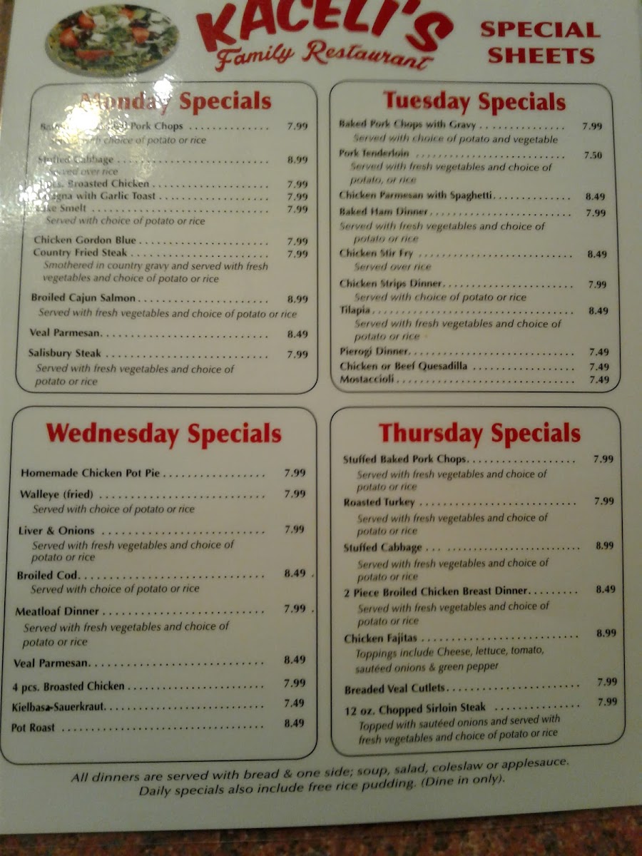 Kaceli’s Family Restaurant offers a straightforward, comforting menu that feels like home on a plate. This family-style café serves classic breakfast favorites alongside hearty lunch and dinner options, inviting guests to enjoy familiar flavors throughout the day. Whether it's a morning start with biscuits and gravy or a relaxed evening meal featuring walleye or broasted chicken, the dishes match the welcoming and easygoing atmosphere.
